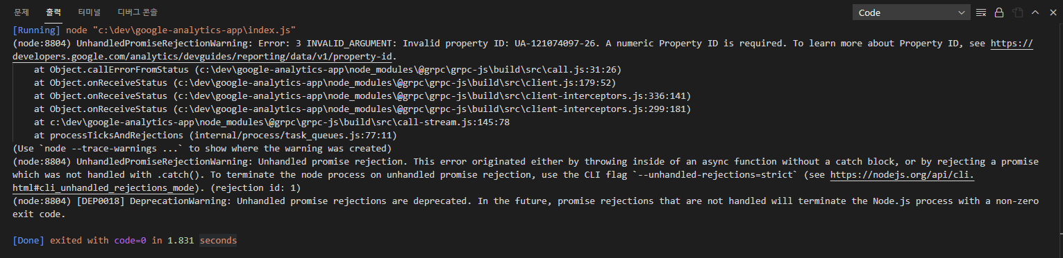 GA4 업그레이드 이전버전(UA = Universal Analytics) 데이터 호출시 아래와 같은 오류가 발생합니다. 구글가이드에 따르면 현재 사용주인 GA가 UA인 경우 Data API 대신 Reporting API V4를 사용하여야 합니다.