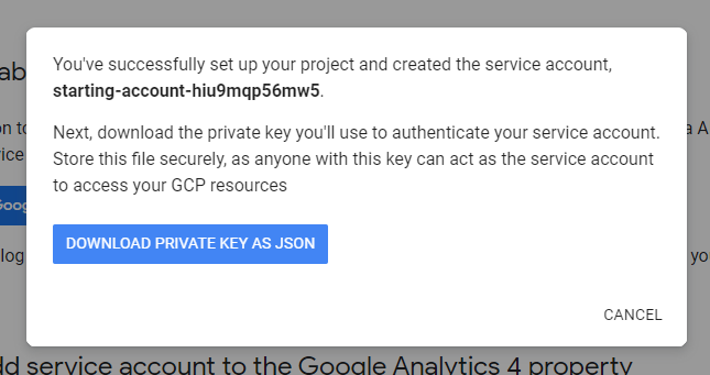 Google Analytics를 사용하기 위해서 일종의 로그인이 필요합니다. 가이드는 Service Account 방식을 권장하는데, 아래 파란색 버튼('Enable the Google Analytics Data API v1')을 클릭하면 이후 단계를 순서대로 진행하게 됩니다. 참고로 아래 Google Analytics 가이드에 'credentials.json'이 다운로드된다고 적혀있으나 실제 파일명은 프로젝트명+자동생성문자 조합의 JSON 파일이 다운로드됨을 확인할 수 있습니다. 파일명이 길거나 외우기 어려우므로 credentials.json 또는 ga-api-key.json 등으로 변경하면 됩니다. 그리고 Service Account 키를 사용하는 것은 Putty같은 터미널에서 GA 프로젝트 서버에 직접 접근이 가능하도록 Private Key를 사용하는 것과 같습니다. 따라서 해당 키를 통해 로컬 --> GA 프로젝트 서버 또는 서버 --> GA 프로젝트 서버에 접근이 가능하게 됩니다.