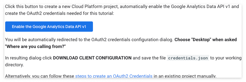 아래 파란버튼('Enable the Google Analytics Data API v1')을 누르면 설명과 같이 아래 3가지 내용이 함께 활성화된다.