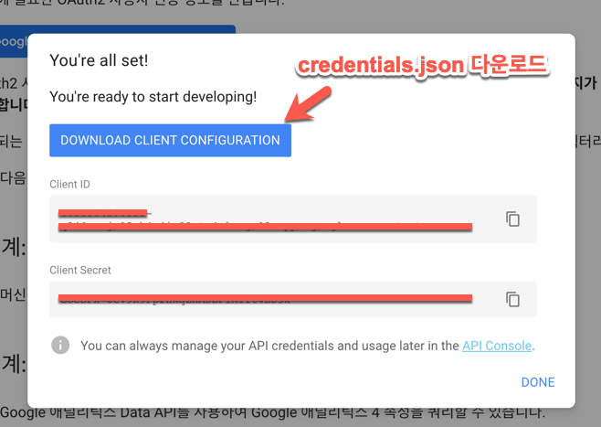 credentials.json은 Step1에서 다운로드한 파일을 활용하고, 경로는 다운로드한 위치를 지정하면 된다.