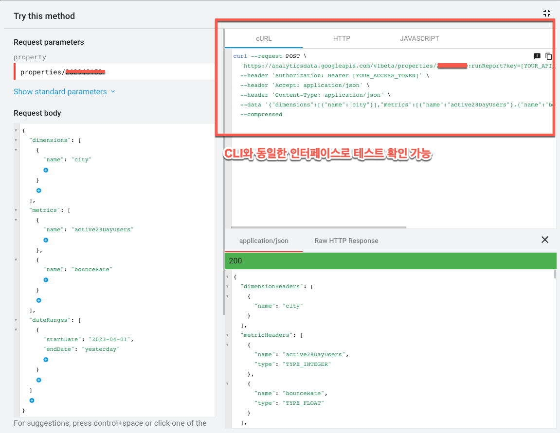 Try this API 선택 시 아래 화면으로 이동한다. 조회하고자 하는 GA4의 Property ID를 동일하게 필수 파라미터로 입력하면 된다.