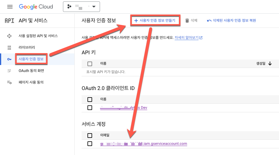서버 단에서 데이터 연동기능을 구현하기 위해 '서비스 계정(service account)'를 생성한 다음 JSON파일을 다운로드합니다.