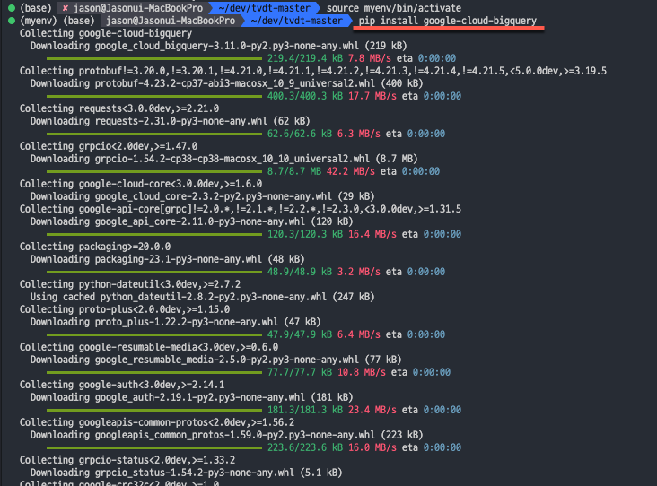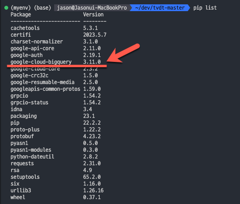 virtualenv 환경에서 빅쿼리 파이썬 라이브러리가 추가되었는지 확인합니다.