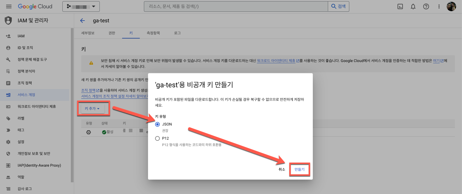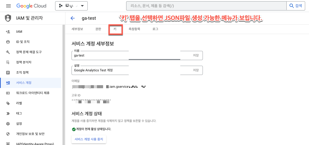 서비스 계정을 새로 만들거나, 기존에 있는 서비스 계정에서 JSON파일을 다운로드 받으면 됩니다.