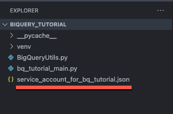 - service_account_for_bq_tutorial.json 파일을 테스트 중인 biquery_tutorial 프로젝트에 추가합니다.