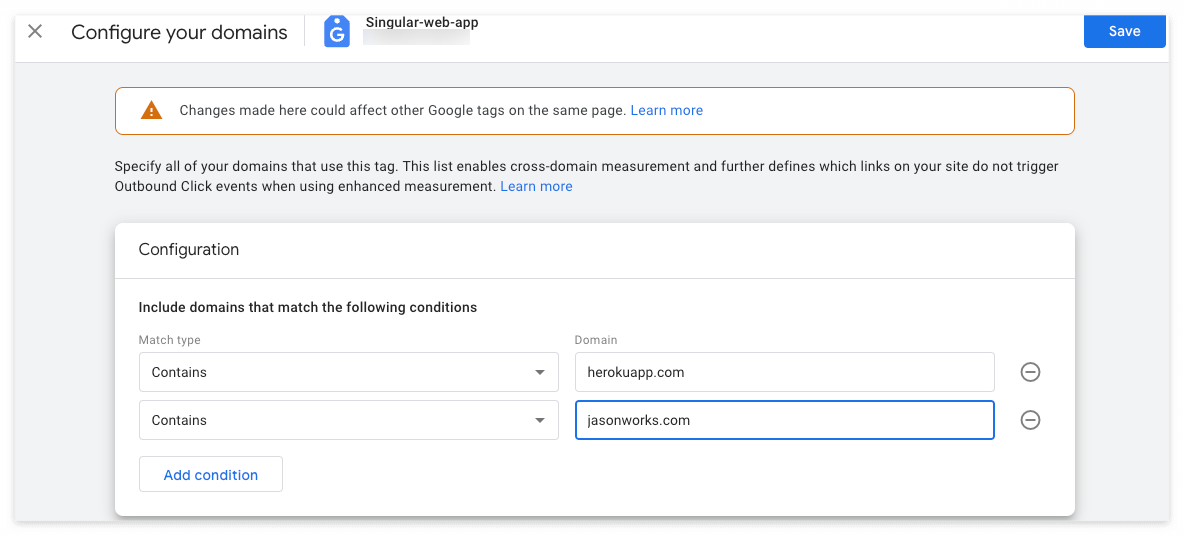 아래와 같이 Configuration 폼에 원래 도메인과 함께 연동할 Domain B를 추가한 다음 저장합니다.