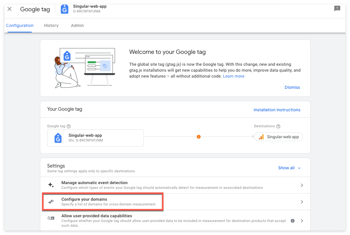 아래와 같이 도메인A에 크로스 도메인 기능을 활성화하는 설정을 진행합니다. 아래 그림과 같이 'Configure tag settings'를 선택합니다.
