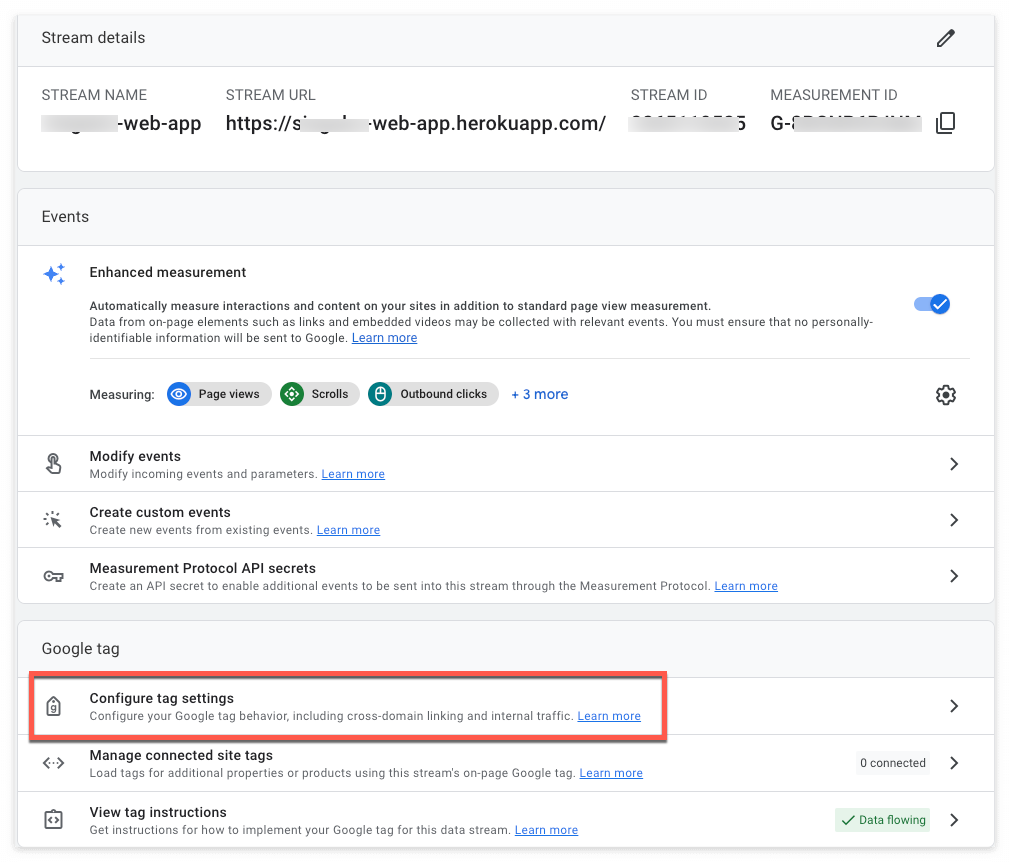 GA4의 경우 Property 세팅에서 크로스 도메인 설정이 가능합니다. (Universal Analytics 크로스도메인 설정방법과 다름)
