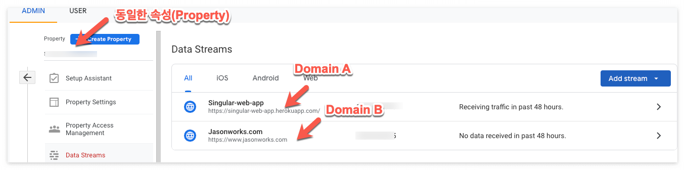아래 그림과 같이 동일한 Property에서 'Add stream'을 눌러 새로 '웹' 데이터 스트림을 추가합니다. 저는 기존에 사용하던 첫번째 도메인(이하 Domain A) 외에 크로스 도메인 테스트를 위해 Jasonworks.com(이하 Domain B)를 추가하였습니다.