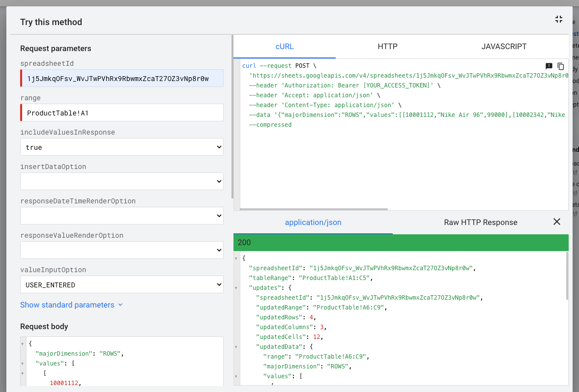 Method: spreadsheets.values.append | Google Sheets | Google for Developers