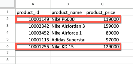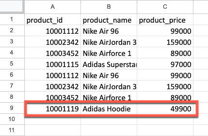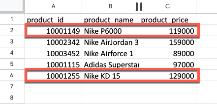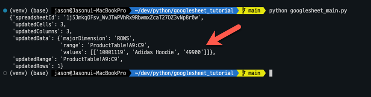 - values: 기존에 작성된 구글시트 헤더에 맞게 product id, product name, product price 순으로 배열을 전달합니다.